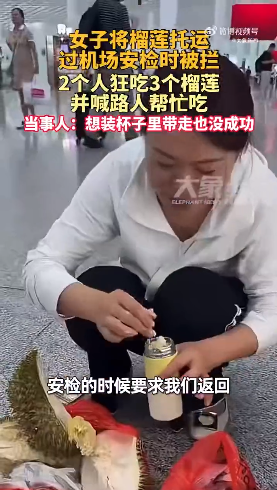 6月21日,广东深圳,一女子将榴莲放在密码箱里试图托运,但被机场安检人员拦了下来,于是只好和同行同事2人狂吃3个榴莲,还喊路人帮忙吃。当事人凌女士表示:“榴莲价值近四百元,扔掉有点可惜,在飞机上打嗝都是榴莲味。”
